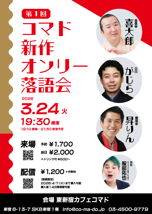 | 【出演者】 | 昔昔亭喜太郎、立川がじら、春風亭昇りん、服部拓也 |